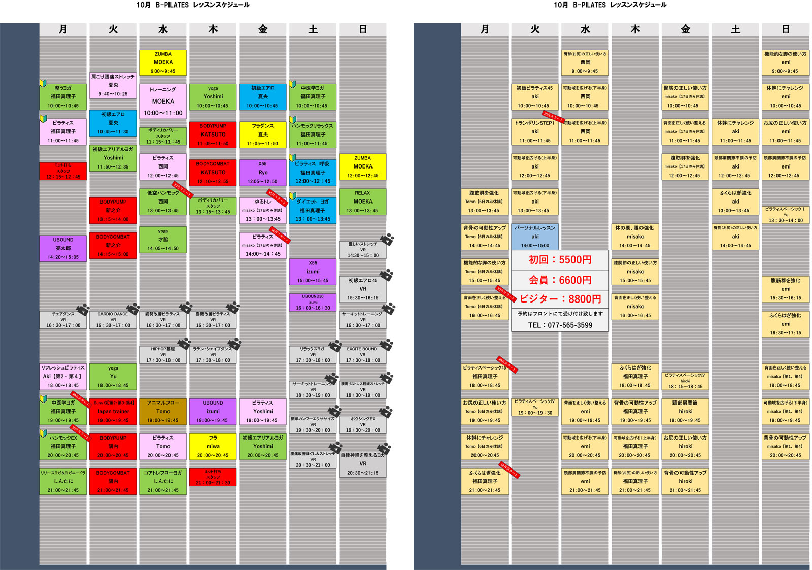 スタジオレッスンのご案内10月レッスンプログラム 1階レッスンスタジオでは、ヨガやピラティス、ZUMBA、エアロ他、多彩なレッスンプログラムを実施しております。» B-PILATESの詳細レッスン内容 BurnG日本とポーランドで共同開発された最先端の新しい空中フィットネス。 バンジーコードを用いて、関節への負担を軽減しながらのカーディオ(有酸素)、コア、コーディネーショントレーニングが出来ます。 ピラティスハリウッドセレブのあいだでも根強い人気を誇る体幹強化・柔軟性向上メソッド。 ヨガ呼吸法といろいろなポーズを組み合わせて柔軟性アップを目的としたレッスンです。 UBOUNDトランポリンを使用し、音楽に合わせてステップを踏みます。 フラダンスハワイアンミュージックに癒されながらフラの基本ステップを習得していただけます。 ZUMBAZUMBAは、コロンビアで使用されているスペイン語でお祭り騒ぎのような意味があります。 様々なラテン音楽に!自由に!リズムに乗って軽快なダンスエクササイズを楽しんでいただけます。レッスン代行情報