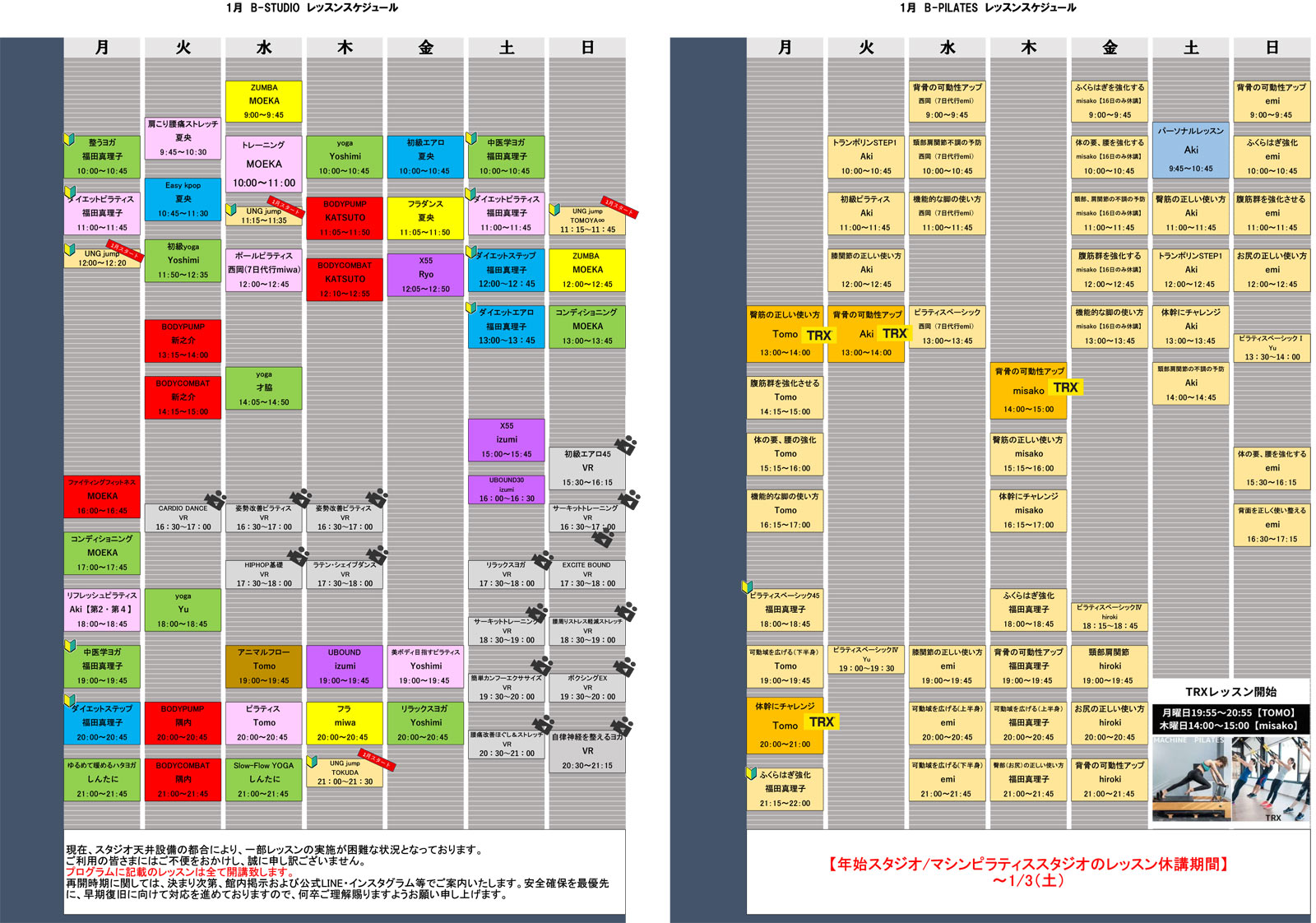 スタジオレッスンのご案内1月レッスンプログラム 1階レッスンスタジオでは、ヨガやピラティス、ZUMBA、エアロ他、多彩なレッスンプログラムを実施しております。» B-PILATESの詳細レッスン内容 BurnG日本とポーランドで共同開発された最先端の新しい空中フィットネス。 バンジーコードを用いて、関節への負担を軽減しながらのカーディオ(有酸素)、コア、コーディネーショントレーニングが出来ます。 ピラティスハリウッドセレブのあいだでも根強い人気を誇る体幹強化・柔軟性向上メソッド。 ヨガ呼吸法といろいろなポーズを組み合わせて柔軟性アップを目的としたレッスンです。 UBOUNDトランポリンを使用し、音楽に合わせてステップを踏みます。 フラダンスハワイアンミュージックに癒されながらフラの基本ステップを習得していただけます。 ZUMBAZUMBAは、コロンビアで使用されているスペイン語でお祭り騒ぎのような意味があります。 様々なラテン音楽に!自由に!リズムに乗って軽快なダンスエクササイズを楽しんでいただけます。レッスン代行情報